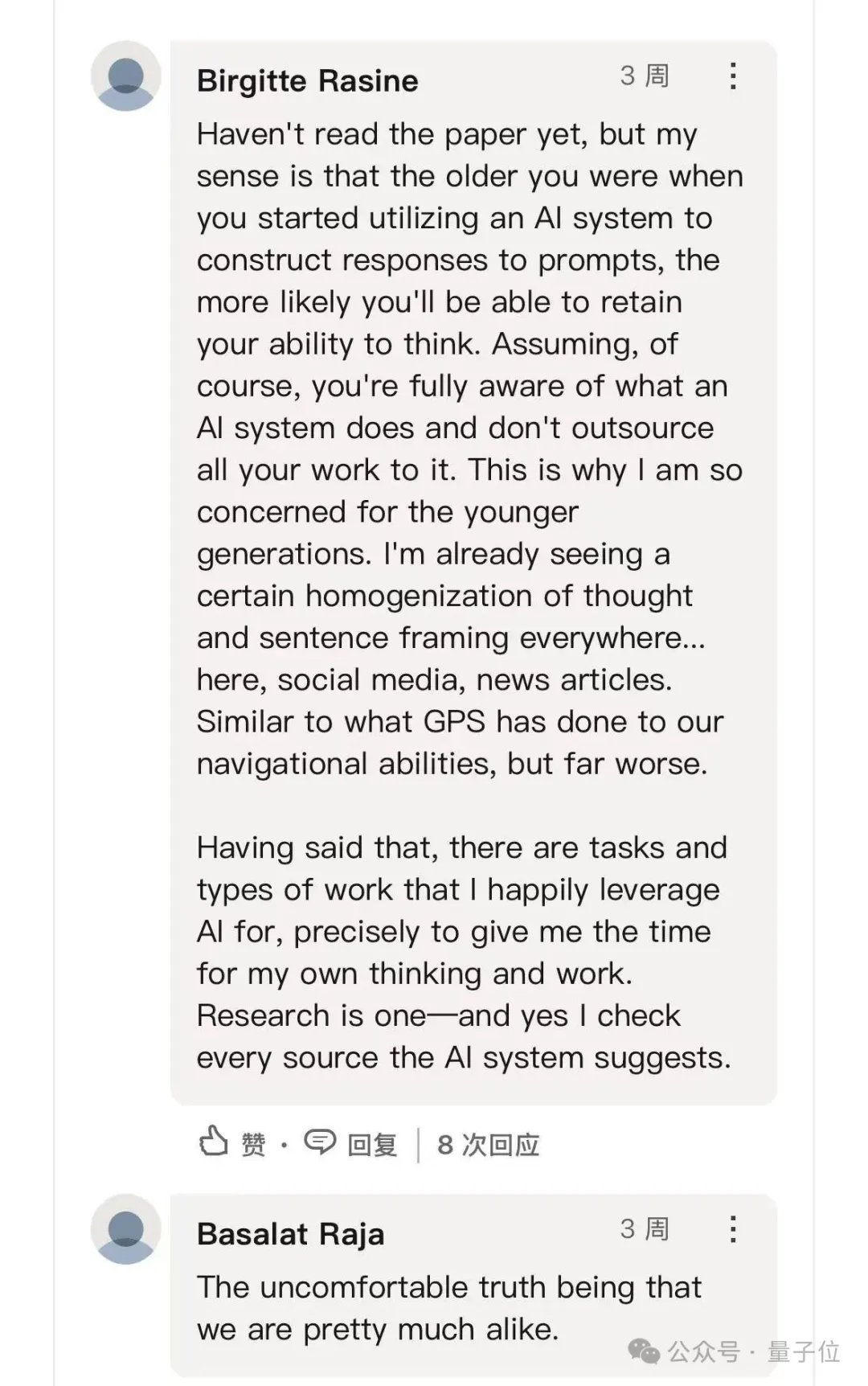有些网友认为:你开始使用AI时的年龄越大,你越有可能保留自己的思考能力——前提是你清楚地知道AI在做什么,并且没有把所有工作都外包给它。