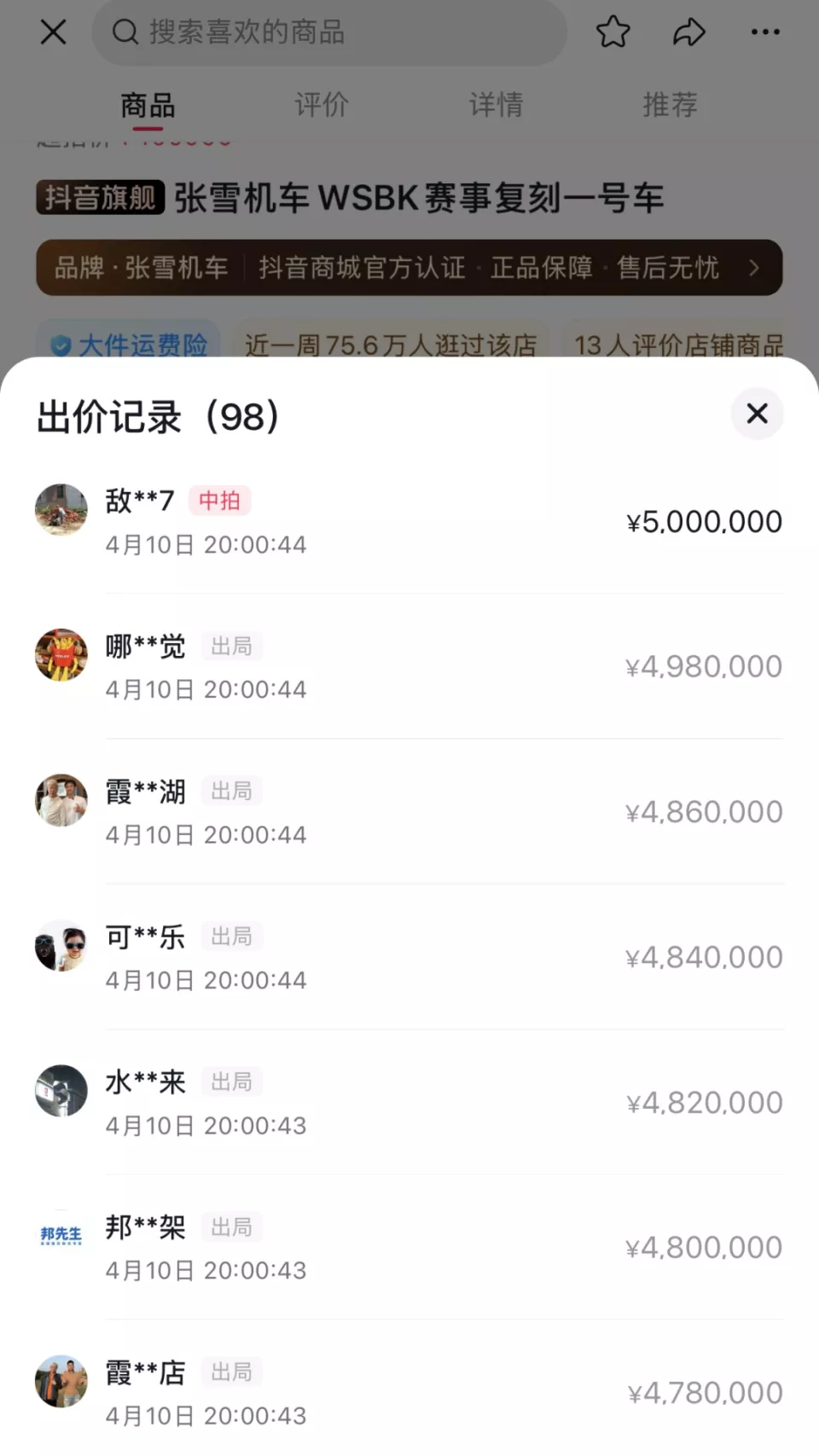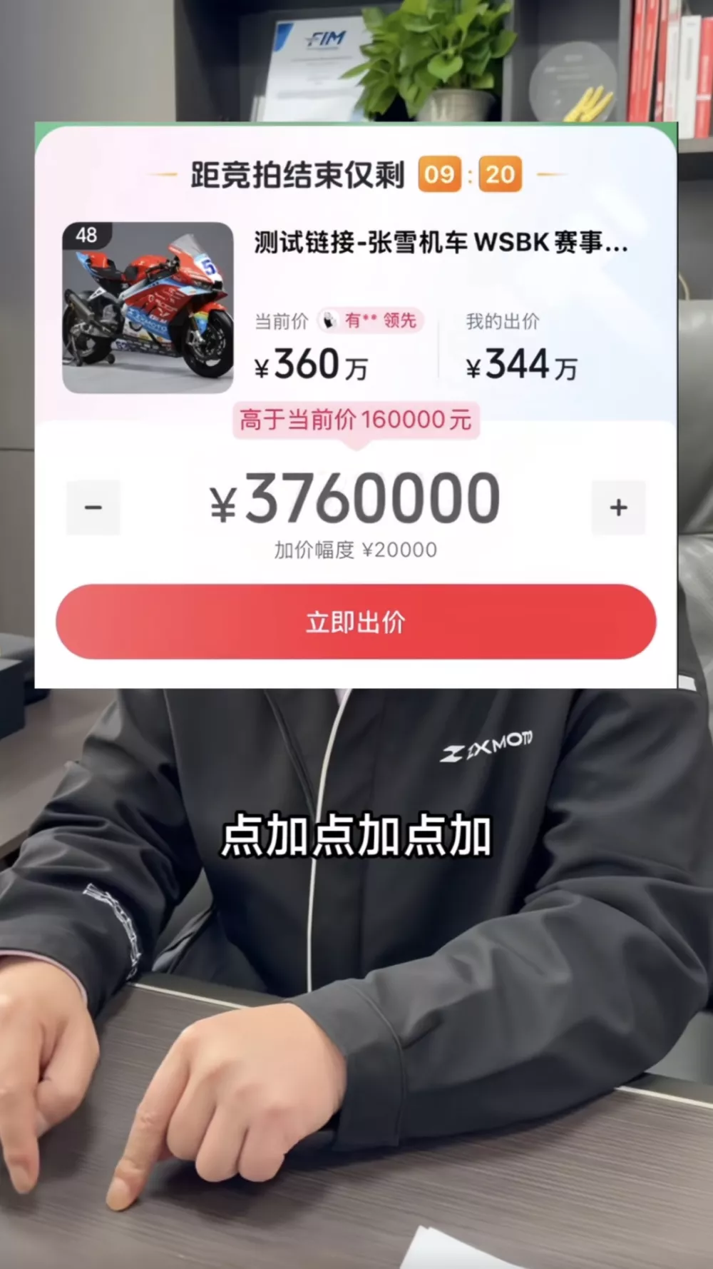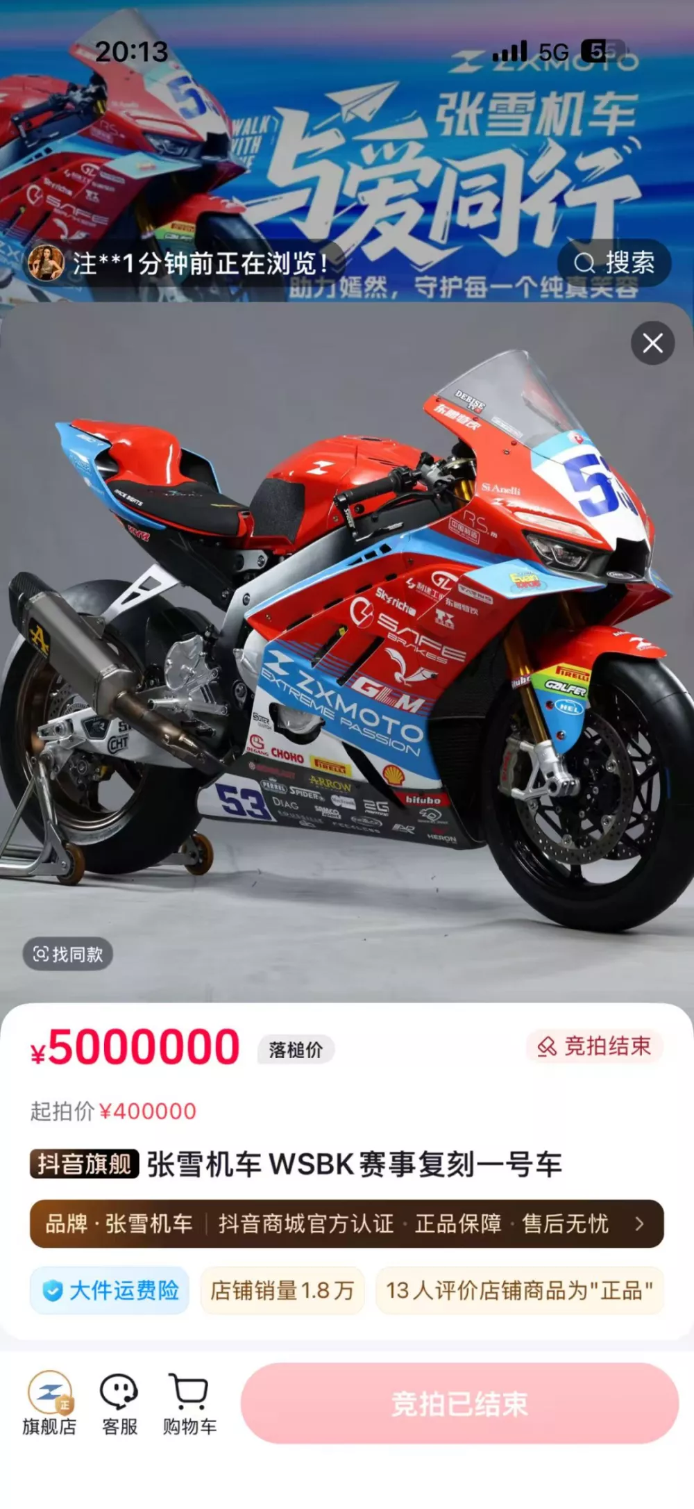 张雪拍卖冠军复刻赛车,不到一分钟出价至500万!