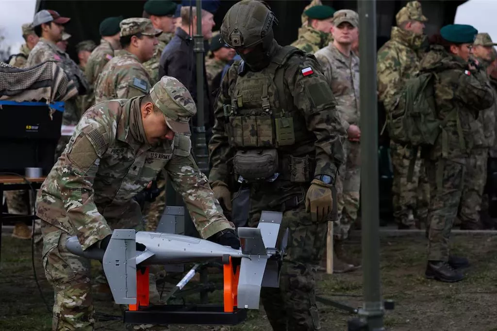 2025年11月18日,在波兰东南部的诺瓦德巴一个训练场上,一名美国士兵正操作AS3拦截器,这是美国制造的模组化AI反无人机系统MEROPS的一部分。(路透)