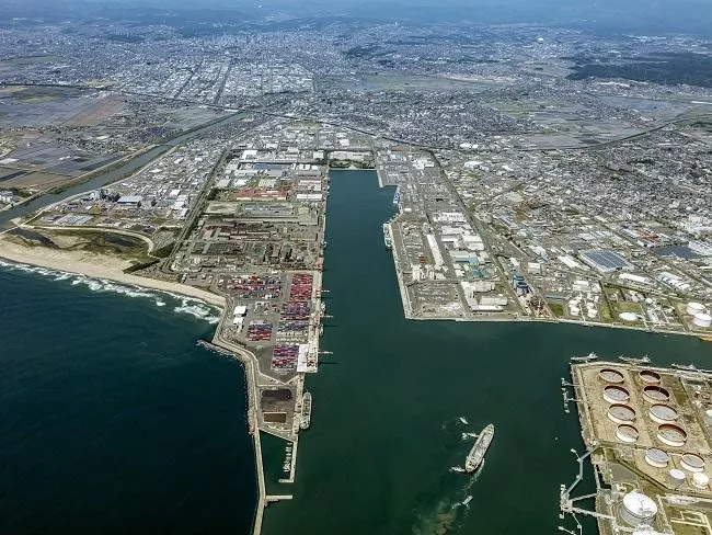 2026年4月9日,为加强国防能力,日本政府指定包括北海道和爱知县在内的17个新机场和港口为“指定用途机场和港口”,以便自卫队和海上保安厅能够顺利使用这些设施进行训练及其他用途。图为被指定的仙台盐釜港航拍图。(网络图片)
