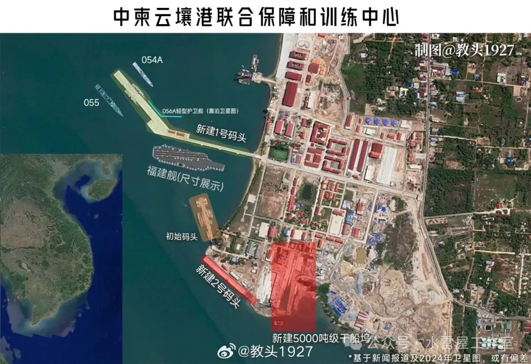 中柬云壤港联合保障和训练中心卫星图示意。(借用微博博主“教头1927”制图)