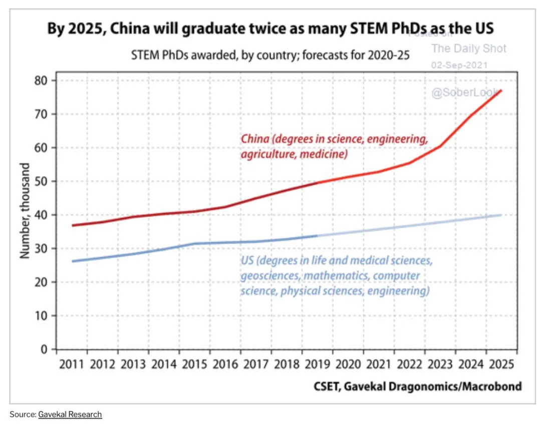 中国目前每年培养的STEM(科学、技术、工程、数学)博士数量,几乎是美国的两倍。