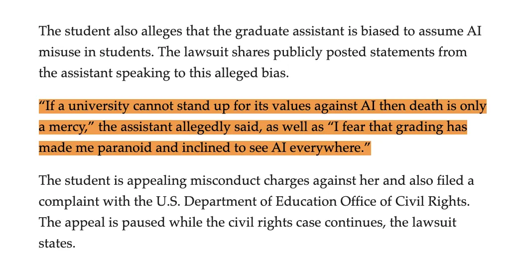 一位名为Jane Doe的女生把学校给告了,原因是她被冤枉用AI写了论文。她本人患有强迫症和焦虑症,由于写作风格太过工整严谨,被助教判定作业是AI写的。