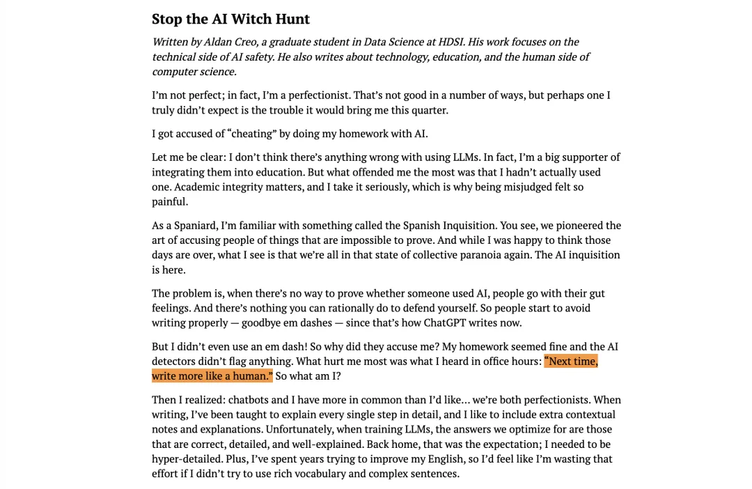 Aldan Creo是UCSD数据科学的研究生,他因为作业写得太完美、太详细,外加上英文不是他的母语,写作风格呆板生硬,三番五次被老师怀疑使用了AI。