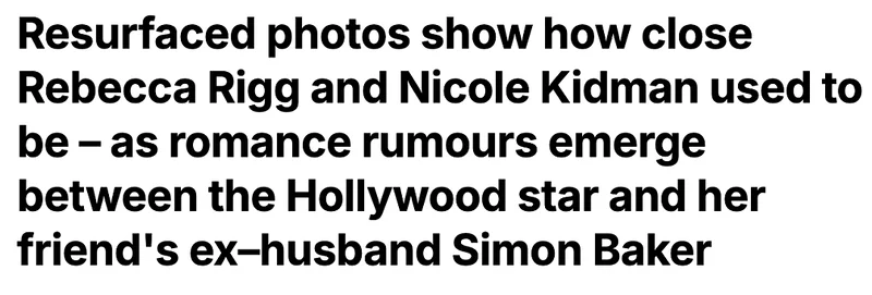 而这场绯闻,也牵扯出更多争议:西蒙·贝克的前妻丽贝卡·里格,竟是妮可相识多年的儿时闺蜜。对于此传闻,丽贝卡感到十分困惑和痛心。