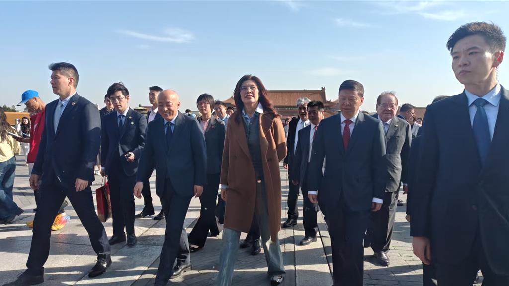 中国国民党主席郑丽文一行,今天下午在中共中央台办主任宋涛、北京故宫院长王旭东等人的全程陪同下,畅游北京故宫。 由于国民党副主席李干龙名字读音和乾隆皇帝一样,访问团成员打趣的说,“你来到主场”,还问他“有没有龙气上身。”当郑丽文逛到中和殿,问说皇帝是不是在这里下罪己诏。 宋涛陪同访问团成员在太和殿前广场合影留念。
