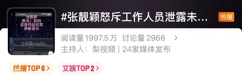 4月11日,话题“张靓颖怒斥工作人员泄露未发行作品”冲上热搜。