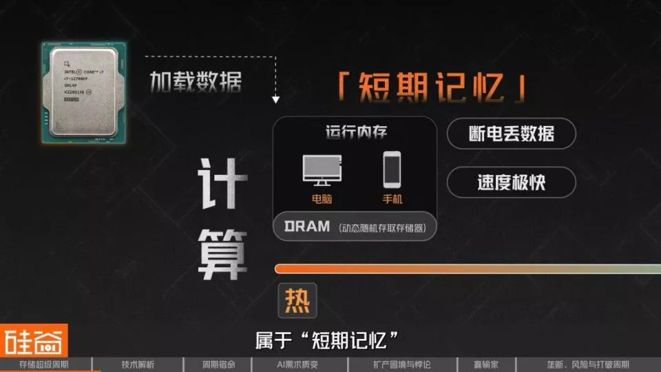 所以最“热”的就是DRAM(动态随机存取存储器),是离计算最近的存储,可以理解为电脑和手机的“运行内存”,芯片在工作的时候,数据必须先加载到DRAM里才能被处理。它的特点是速度极快,但断电就丢数据,属于“短期记忆”。