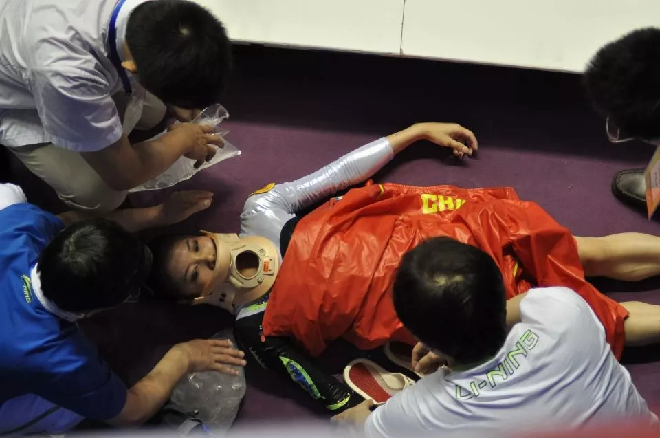 〓 2012年5月11日,吴柳芳在全国体操锦标赛平衡木决赛中受伤。