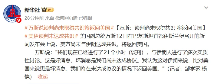 美国副总统万斯12日在巴基斯坦首都伊斯兰堡召开的新闻发布会上说,美方尚未与伊朗达成共识,将返回美国。