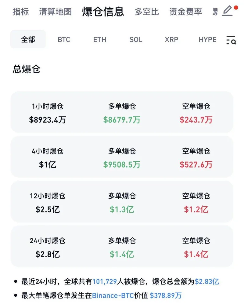 CoinGlass数据显示,过去24小时,加密货币市场共有超10万人爆仓,爆仓总金额为2.83亿美元。