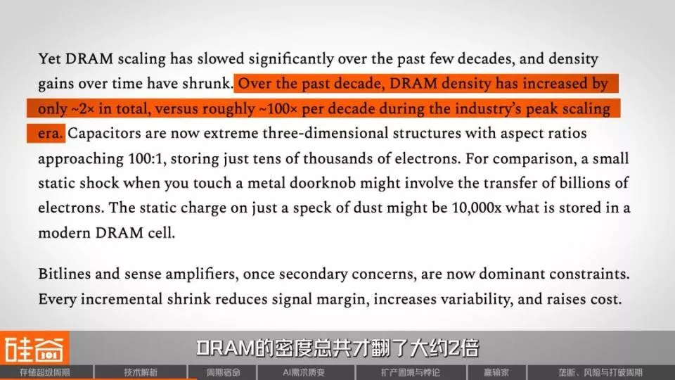 但如今不行了,SemiAnalysis的报告指出,过去十年DRAM密度总共才翻了大约2倍,而以前是每十年100倍,缩放已经严重放缓了。这意味着存储芯片的成本下降,不再像以前那样靠技术进步“自动”实现,而是更多取决于产能的增减和供需的博弈。