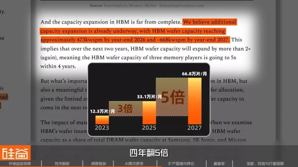 SemiAnalysis的追踪数据显示,2023年底,三大存储厂商分配给HBM的晶圆产能大约12.3万片/月。到2025年底涨到了33.1万片/月,两年扩了将近3倍。预计到2027年底还会进一步到66.8万片/月,四年翻5倍。
