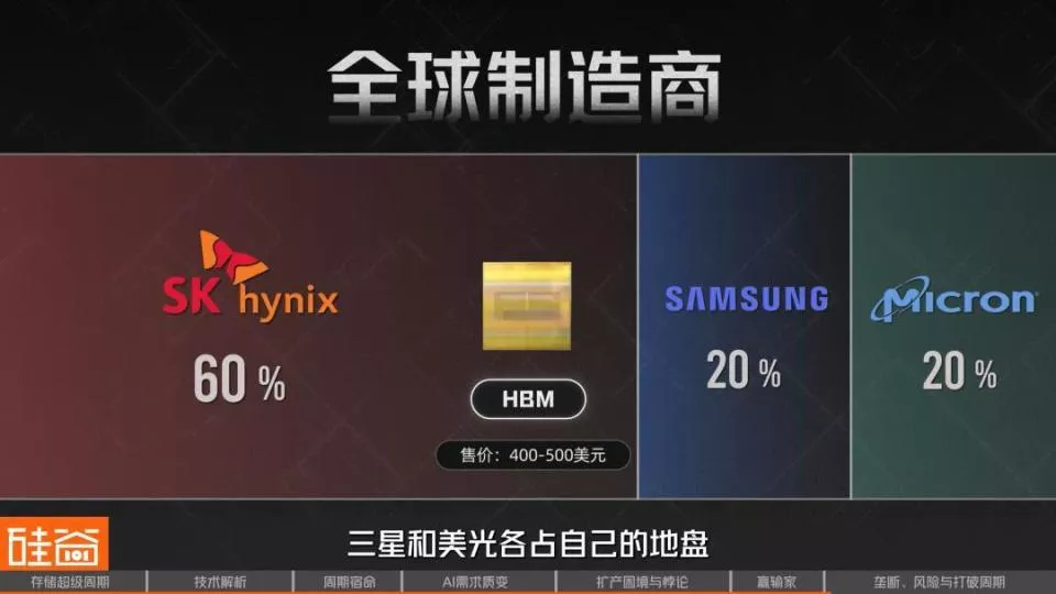 把这一切推上巅峰的核心产品,是HBM(高带宽内存)芯片。一块指甲盖大小的HBM,售价400到500美元,这比同等重量的黄金还贵。而全球能做这产品的,就三家:SK海力士占大约6成,剩下的是三星和美光各2成。