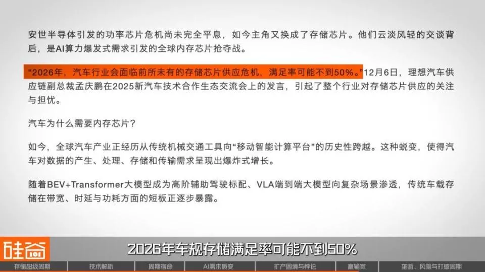 汽车行业也没能幸免,理想汽车供应链副总裁公开警告,2026年车规存储满足率可能不到50%。蔚来李斌说“今年最大的成本压力是内存”。雷军在直播中坦言“光车用内存一项,成本就要增加几千块”。