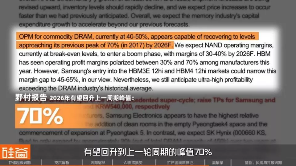 至于行业利润率,野村的口径是2026财年,通用DRAM原厂利润率,有望回升至上一轮周期的峰值70%。而J.P.Morgan更激进,它的说法是到2027年,营业利润率可能超过80%,甚至要高于上一轮的峰值。
