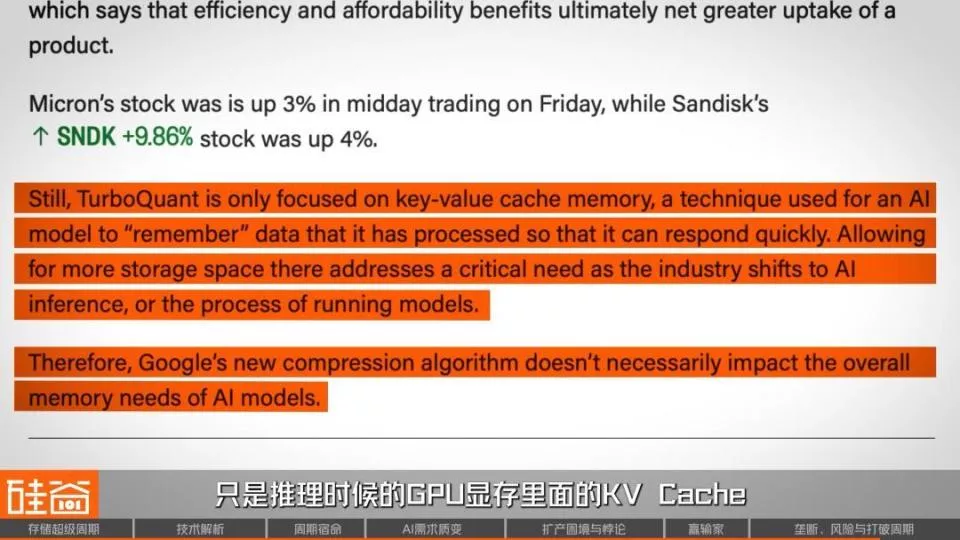 但很快,业内有声音反驳说:这次暴跌是一场乌龙。首先这篇论文发表于一年前,且本身存在一些学术上的争议。并且这个算法目前只在Gemma、Mistral等小模型上验证过,70B以上模型、MoE架构、百万级token上下文,这些AI内存需求真正爆炸的场景,都没有。还有技术人士出来说,在技术上,TurboQuant压缩的只是推理时GPU显存里的KV Cache,是AI内存需求三大来源之一,但训练环节完全不受影响。