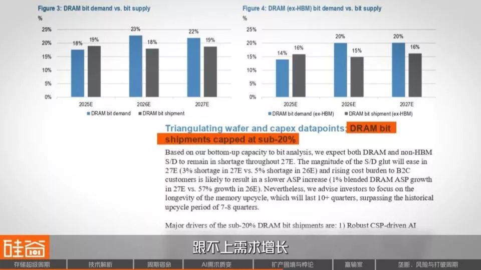 来自J.P.Morgan研报中的供需模型也得出了类似结论:DRAM的供给增长,在未来两年将被压制在20%以下,跟不上需求增长。