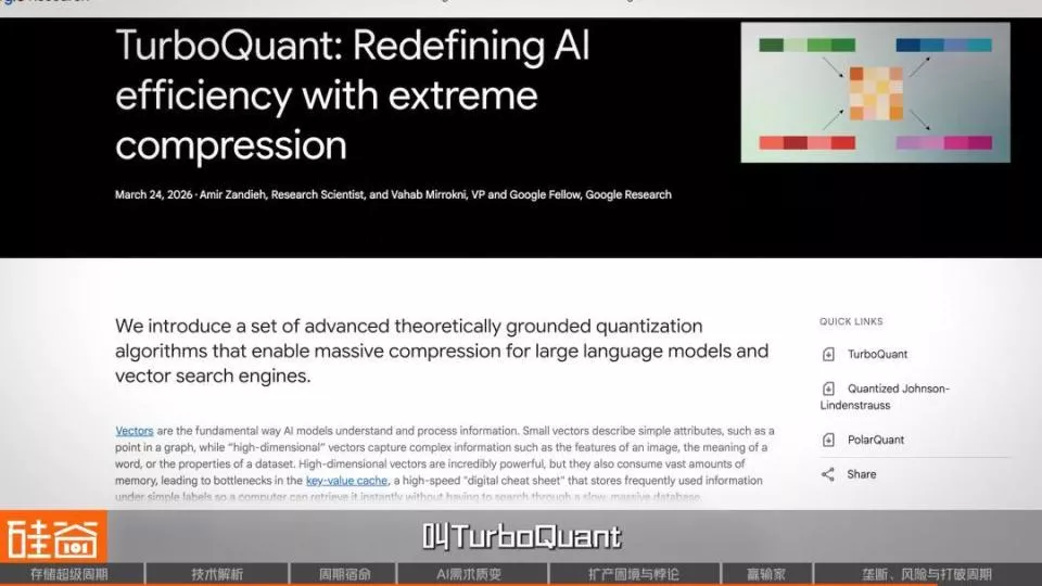 比如说,3月底,谷歌发布了一个新算法TurboQuant,号称是一个高效AI内存压缩算法。发布之后是直接轰动了硅谷科技圈,更是引发存储板块的全线暴跌。