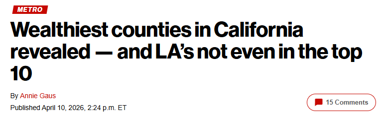 事实上,全美收入最高的十个县中有四个位于北加州。像希尔斯堡(Hillsborough)和阿瑟顿(Atherton)这些硅谷社区的天价房产价值,加之风险投资家和其他科技巨头的集中,推动圣马特奥县整体“财富指数”达到加州最高。