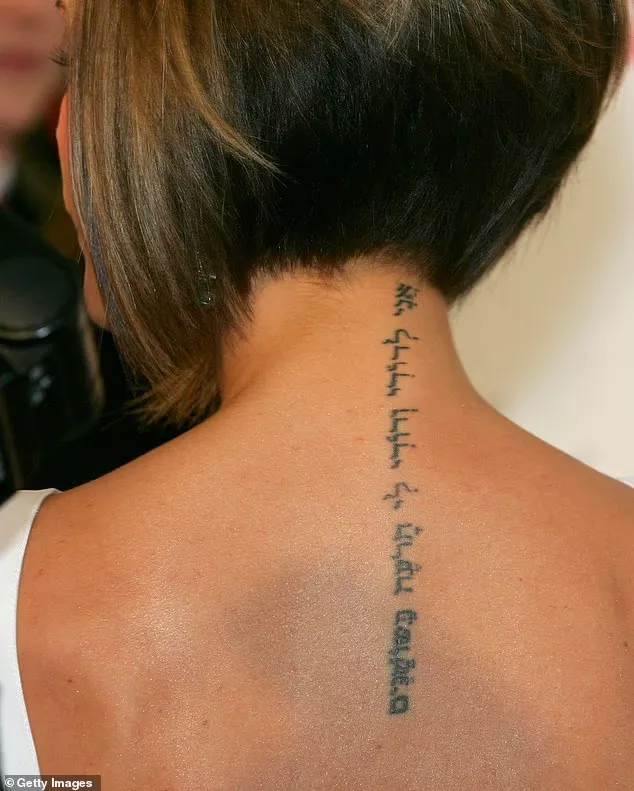 在星星图案上方,顺着她的背部向下,曾纹有一首希伯来语诗歌。这处大型纹身意为“我属我的良人,我的良人也属我”。维多利亚曾自豪地展示过这处图案,而大卫的手臂上也有相同的纹身。