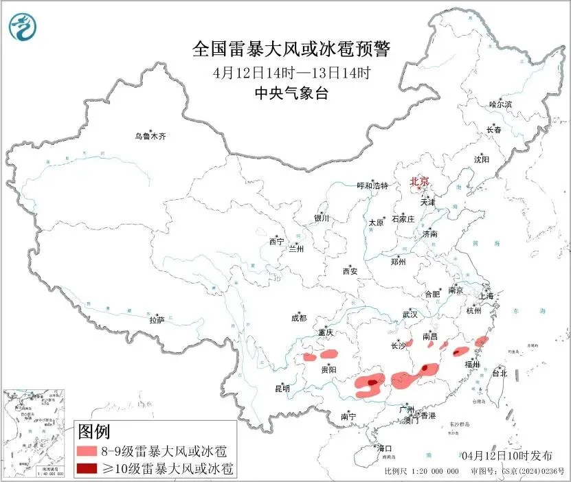 预计4月12日14时至13日14时,江南中南部和东部、华南北部、西南地区东部等地的部分地区将有8级以上雷暴大风或冰雹天气,其中,江西南部、福建中北部、广西北部等地部分地区将有10级以上雷暴大风,最大风力可达11级以上;江南中南部和东部、华南北部、西南地区东部等地的部分地区将有小时雨量大于20毫米的短时强降水天气,其中,江西中南部、广西东北部等地的部分地区小时雨量大于50毫米。