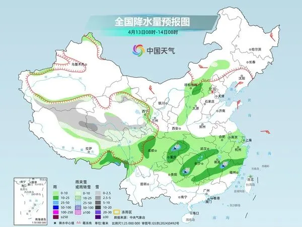 4月12日至14日,南方降雨范围仍然较大,降雨强度总体减弱,以小到中雨为主,部分地区中到大雨,局地有暴雨。同时,青藏高原等地部分地区雨雪天气频繁。