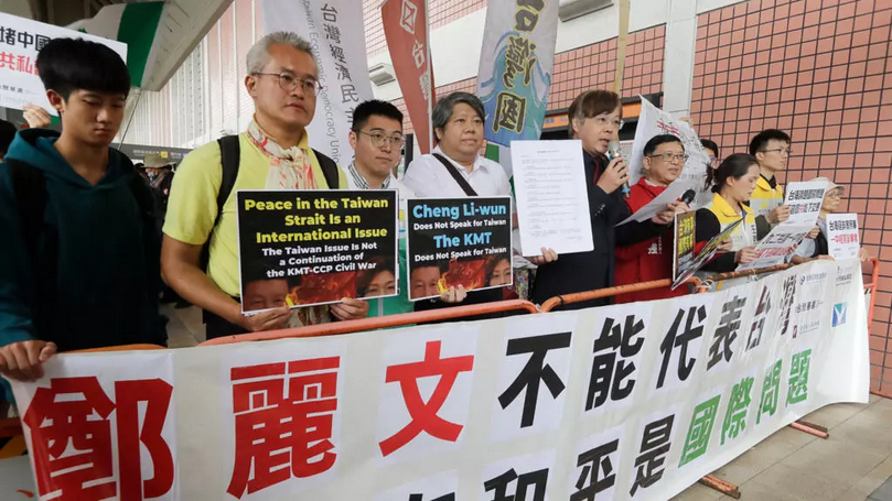 2026年4月7日星期二,在台湾台北松山机场外,抗议者举着标语,阻拦台湾主要反对党国民党主席郑立文前往中国大陆。(美联社照片/ Chiang Ying-ying) AP - Chiang Ying-ying