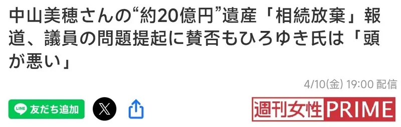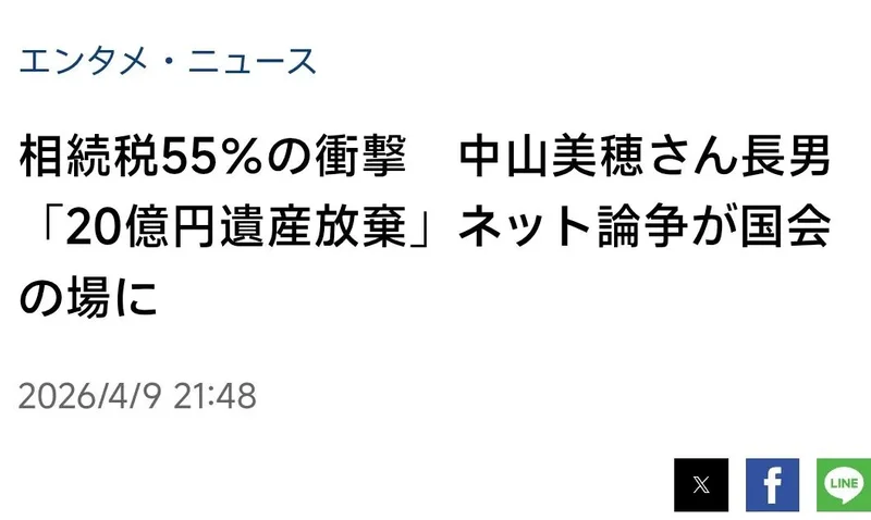 2026年4月9日,日本参议院召开财政金融委员会审议,参政党的参议员塩入清香在质询中,直接以中山美穗的遗产争议为例,当面质问财务大臣片山皋月。她表示:“我想大臣您也知道,中山美穗女士的儿子已经放弃继承20亿日元的遗产,据说遗产税高达11亿日元。最近关于遗产税过于沉重的疑问,在国民之间的关注度明显上升。”