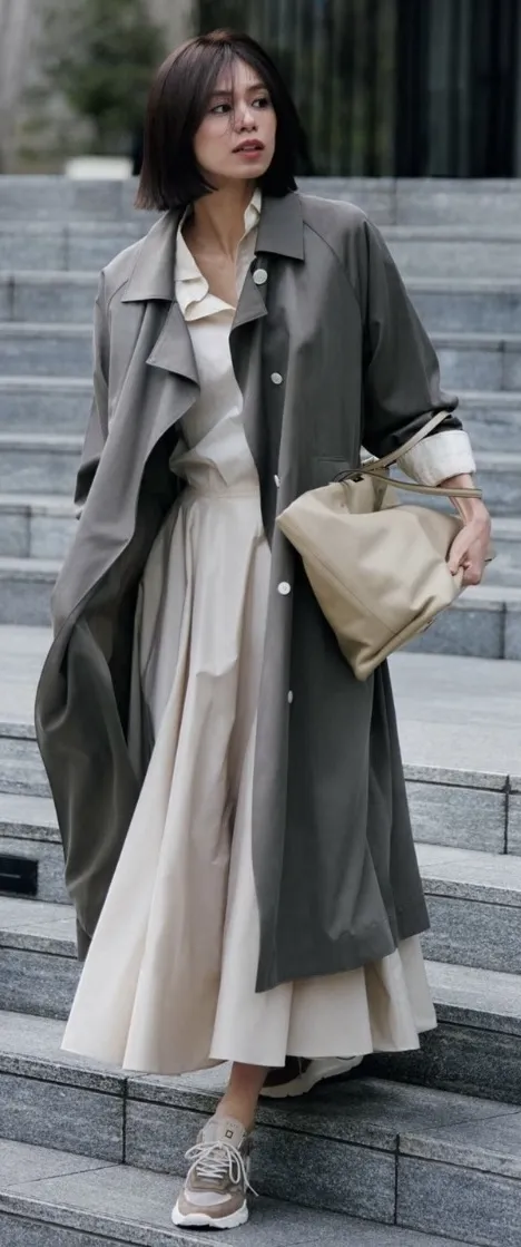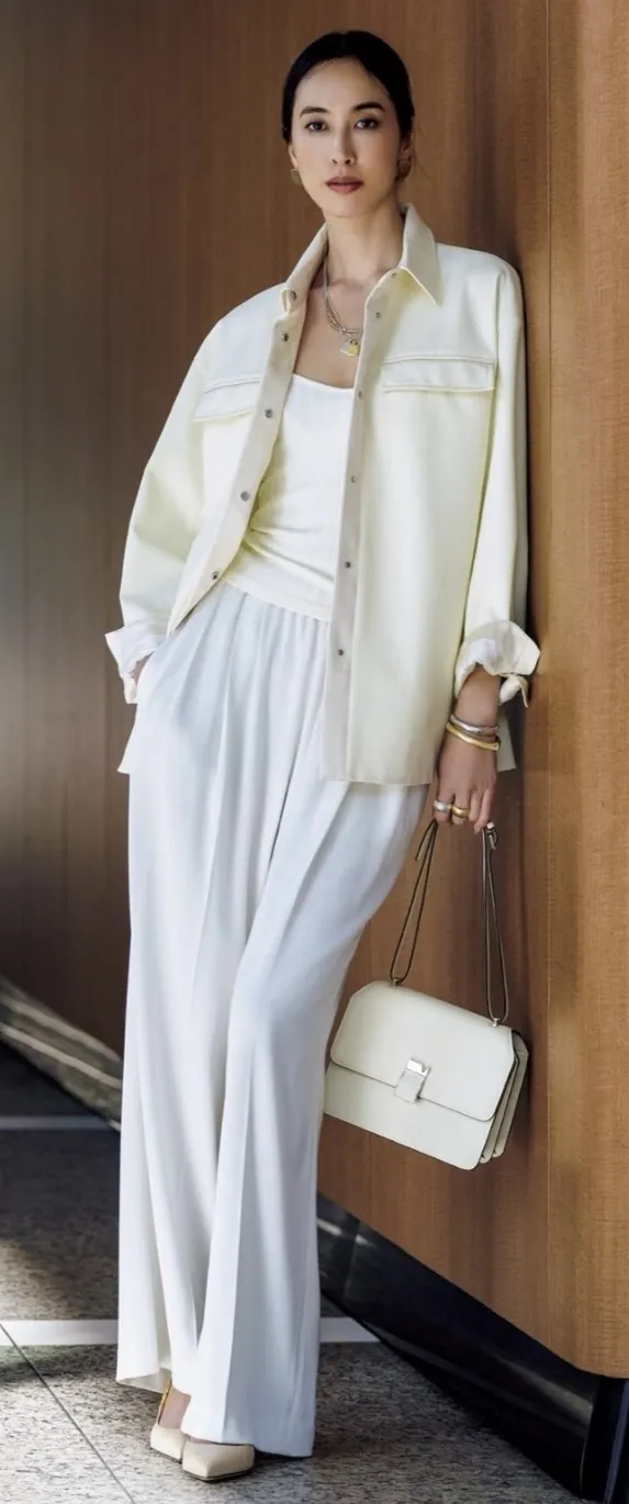 衬衫、一步裙、风衣、西装西裤,等等,一定选看上去质感好的,别管有没有职场,反正知性立马有,任何人都管用。