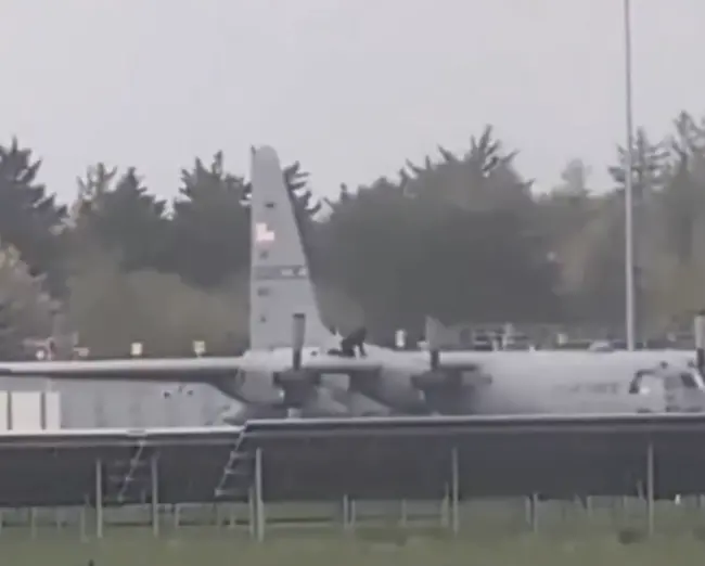 RT称,网上流传的视频显示,一名男子爬上了一架停放在该机场一条偏僻滑行道上的美军C-130“大力神”运输机,并疑似用斧头或锤子式样的工具砸向飞机机身。爱尔兰警方表示,嫌疑人是一名40多岁的男子,他擅自闯入机场禁区,随后被捕。