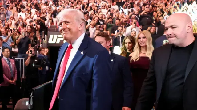 伊斯兰堡谈判彻夜进行期间,特朗普(中)到佛罗里达迈亚密观看终极格斗冠军赛(UFC)。