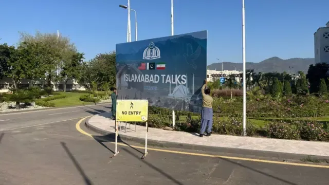 图像加注文字,美伊和谈破裂,巴基斯坦人员早上在伊斯兰堡会场外拆除布景板。
