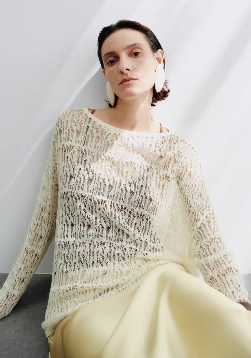 配一件细针织上衣,袖口微卷,颈间无饰胜有饰。