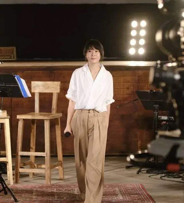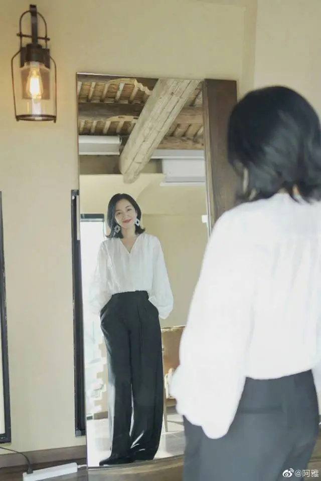 阿雅,白色上衣搭配灰色阔腿裤,搭配大耳环,有知性优雅。