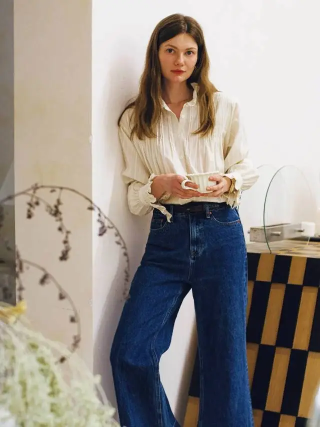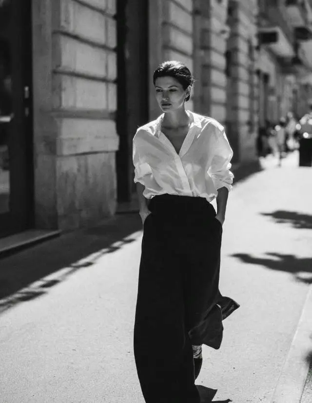 散发着光泽的米白真丝衬衫,质感,简单的剪裁,穿在身上,得体有余量,不紧身,也不是Oversive版型,可以感觉到穿它的人松弛、自信、游刃有余。