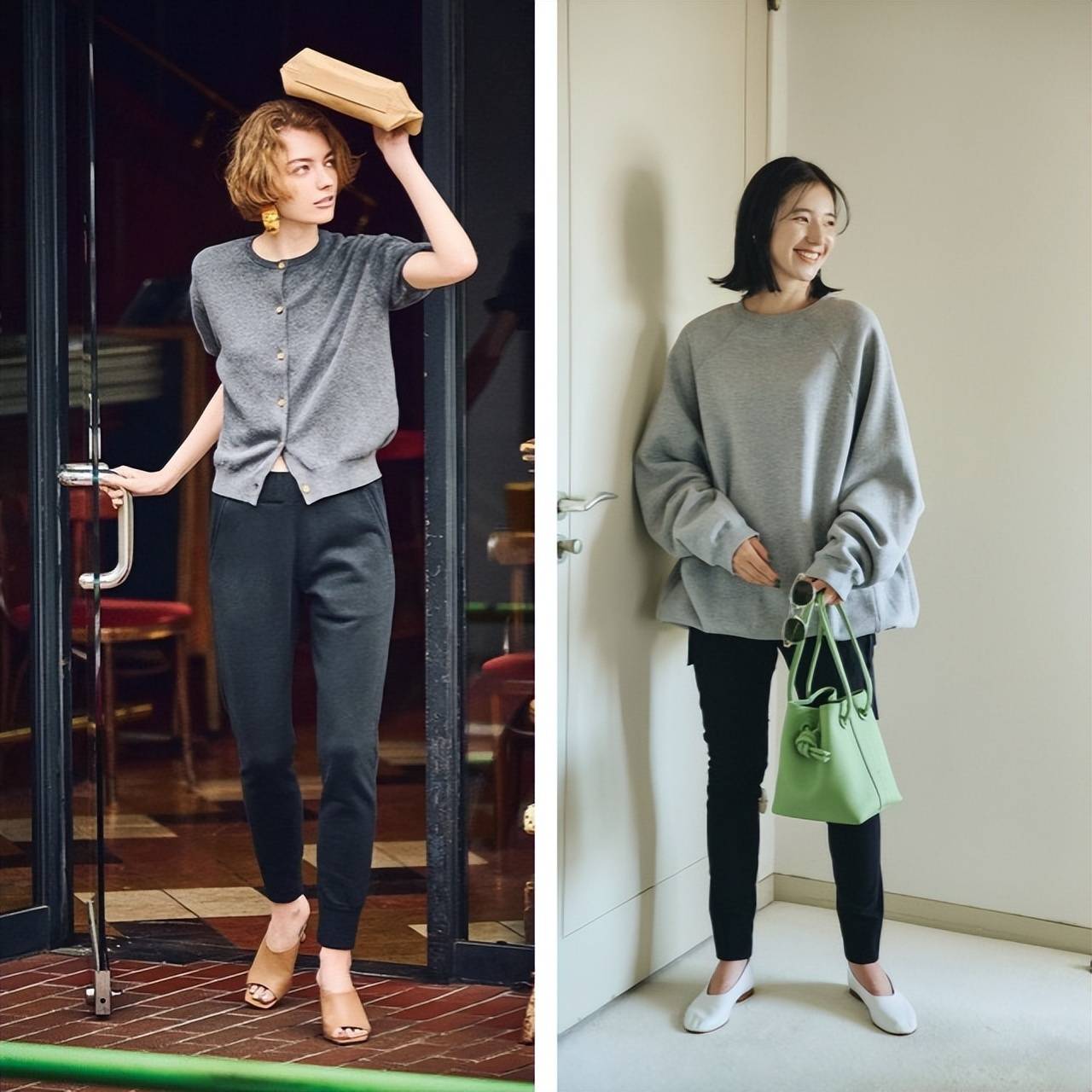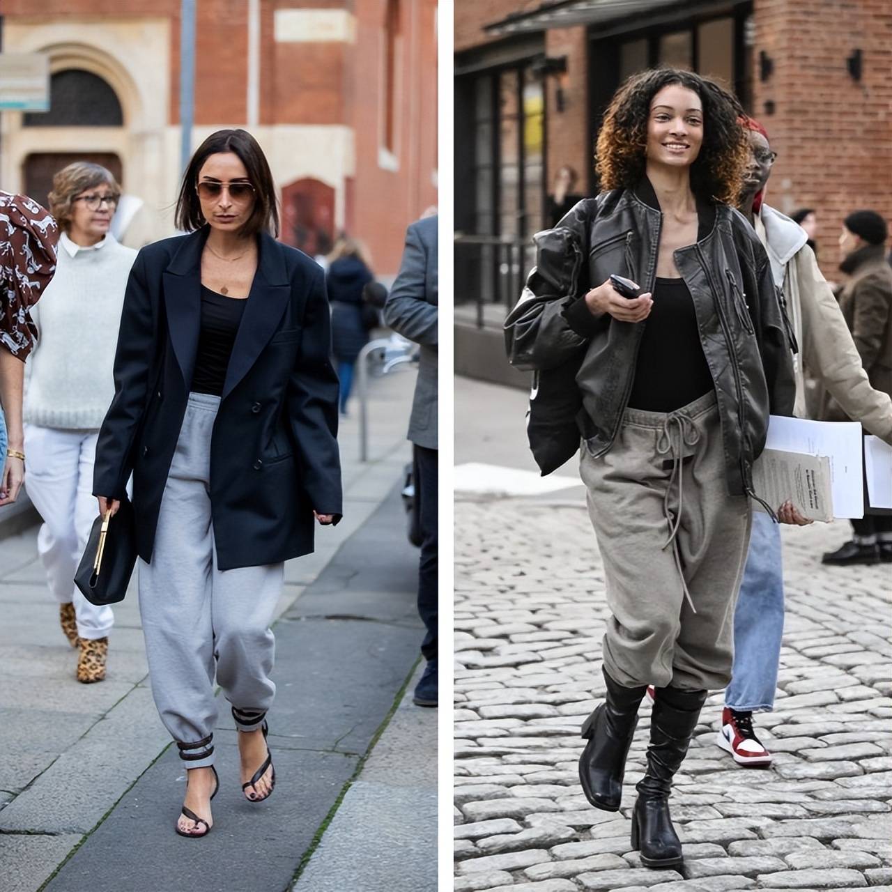 灰色运动裤搭配oversize夹克,打造都市感造型。通过内搭和凉鞋露出肌肤,为休闲穿搭增添恰到好处的利落感。