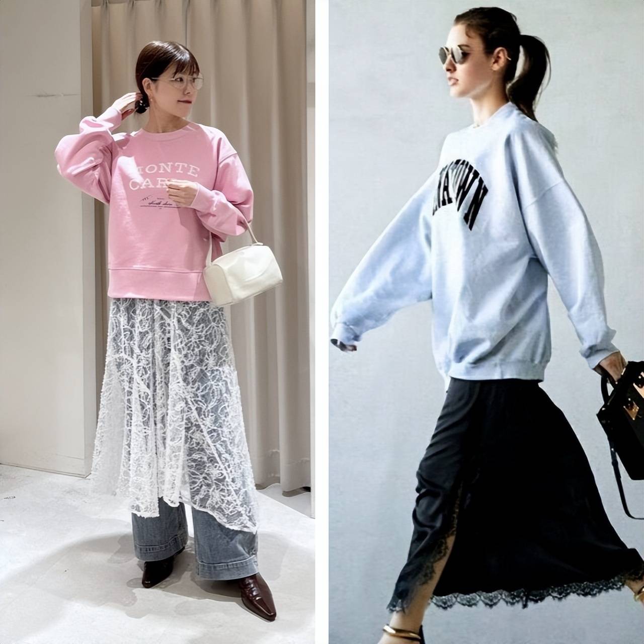 黑色运动衫搭配当季流行的蕾丝半身裙,用休闲的上衣中和蕾丝的甜美感。通过半身裙的开叉和脚上的凉鞋减轻厚重感,营造出轻盈的造型。