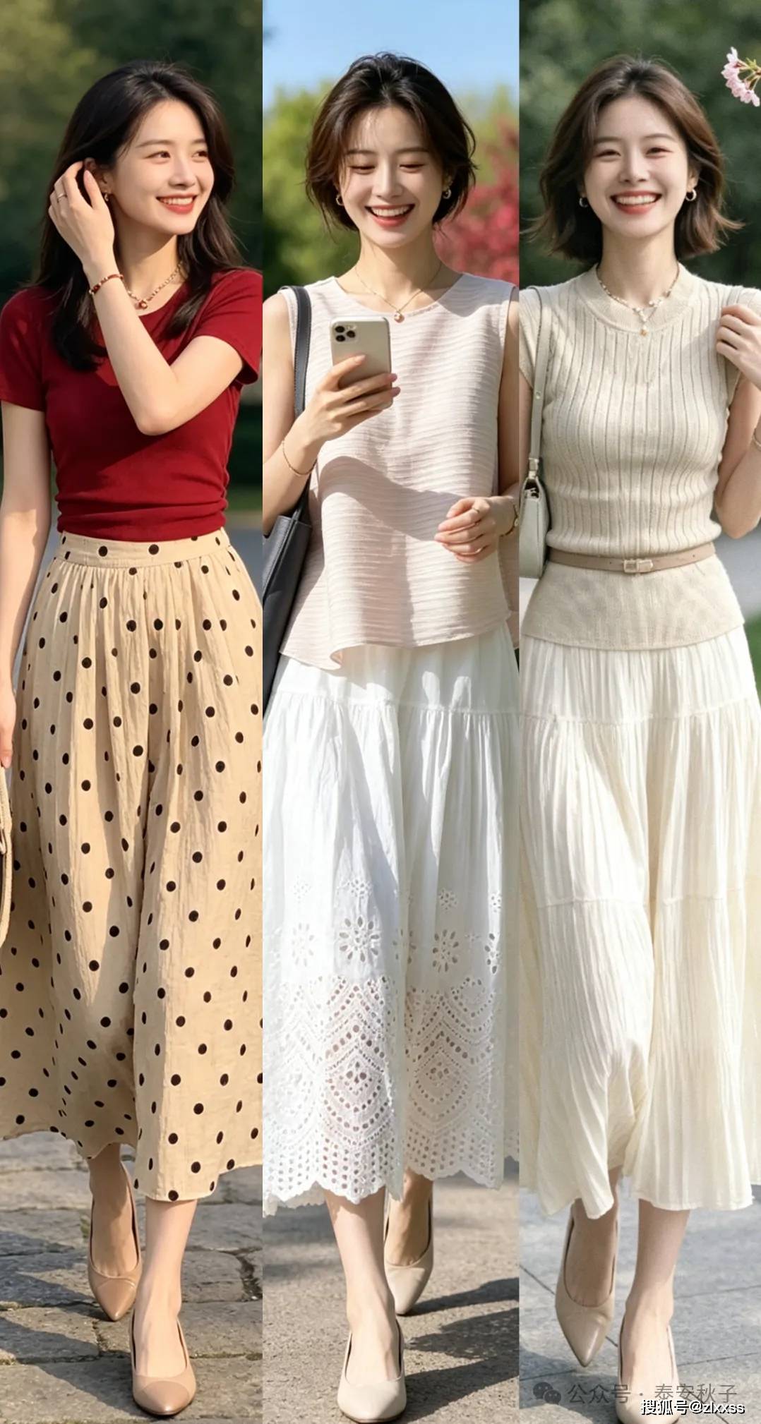 另外裙摆也要宽松一点,不要紧紧贴在腿上,这样既能藏住大腿和胯部的肉肉,走起路来也自在飘逸,让整体造型看起来更显瘦更得体。
