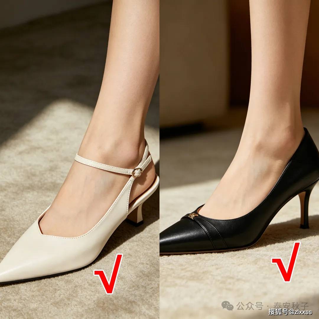 除此之外,还要注意鞋口的高度:鞋口卡在脚踝骨下面一厘米的高度,穿起来不仅能把脚踝上的肉肉藏住显腿长,还能轻松隐藏粗脚踝、短跟腱等小缺点。