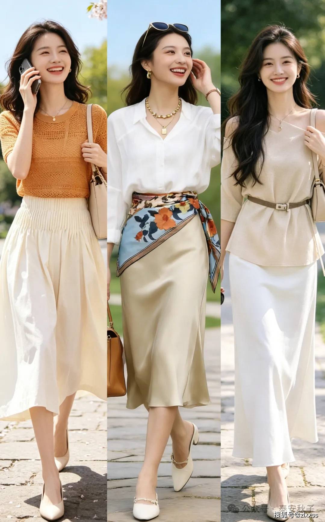 春末夏初选半身裙时,建议大家多选垂而不塌,软而不贴的面料,比如西装料、醋酸料、细针织料等材质。