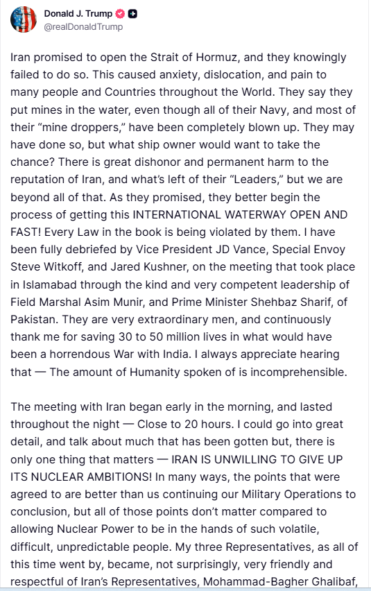 伊朗承诺开放霍尔木兹海峡,却明知故犯。这给世界各地的许多国家和人民带来了焦虑、混乱和痛苦。他们声称在海峡布设了水雷,尽管他们的海军以及大部分“布雷艇”都已被彻底摧毁。他们或许真的布设了水雷,但哪个船东愿意冒这个险呢?伊朗及其残存的“领导人”的声誉遭受了巨大的耻辱和永久性的损害,但我们已经超越了这些。正如他们承诺的那样,他们最好立即着手开放这条国际航道!他们正在违反所有法律。我已听取了副总统约翰·万斯、特使史蒂夫·威特科夫和贾里德·库什纳关于在伊斯兰堡举行的会议的全面汇报。此次会议由巴基斯坦陆军元帅阿西姆·穆尼尔和总理谢赫巴兹·谢里夫主持,会议召开得非常顺利。他们都是非常杰出的人,他们不断感谢我,因为我避免了与印度之间那场可怕的战争,拯救了三千万到五千万人的生命。我总是很感激听到这些——他们所展现的人性光辉令人难以置信。