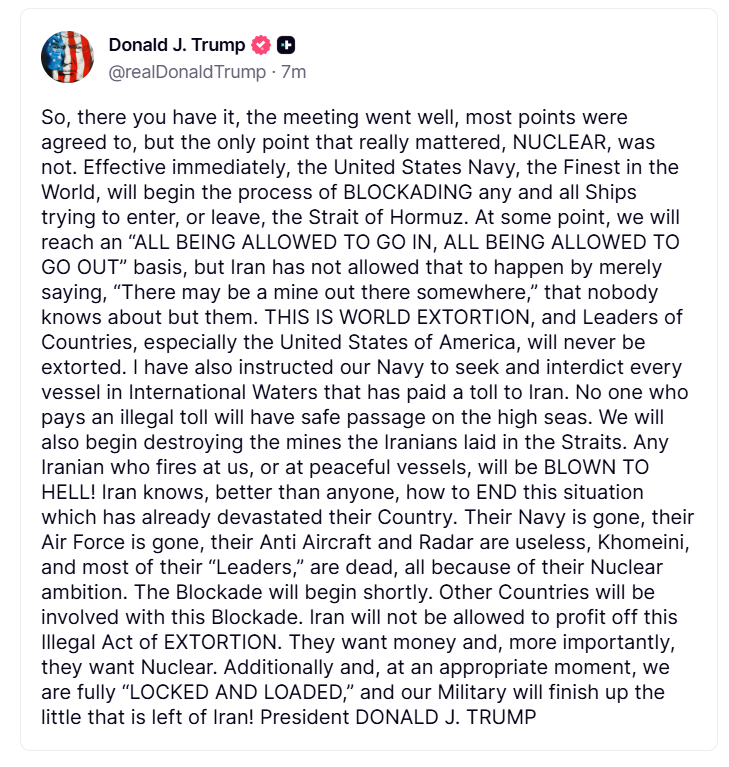 即日起,世界最精锐的美国海军将开始封锁所有试图进出霍尔木兹海峡的船只。我们最终会实现“所有船只均可进出”的局面,但伊朗却以“某处可能有水雷”为由阻挠了这一进程,而这水雷只有他们自己知道。