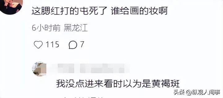 更辣眼睛的是她的妆容,不知道是自己随手化的,还是化妆师没在线,腮红打得简直离谱。