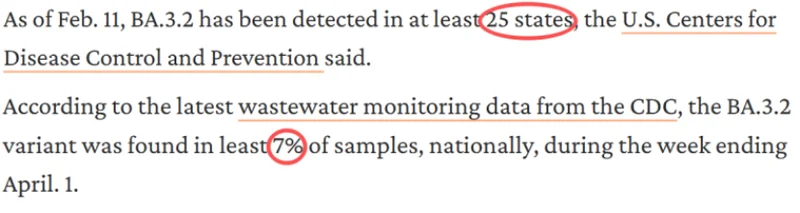 美国疾病控制与预防中心(CDC)表示,截至今年2月11日,已至少在全美25个州检测到BA.3.2。截至4月当周,全国至少7%的样本中发现了BA.3.2变异株。