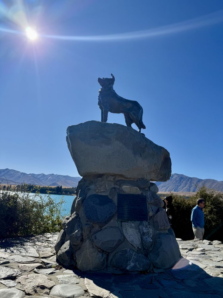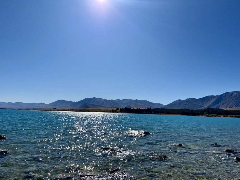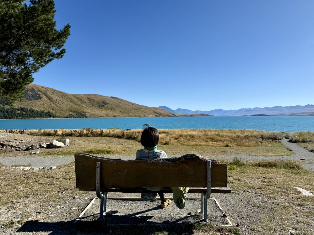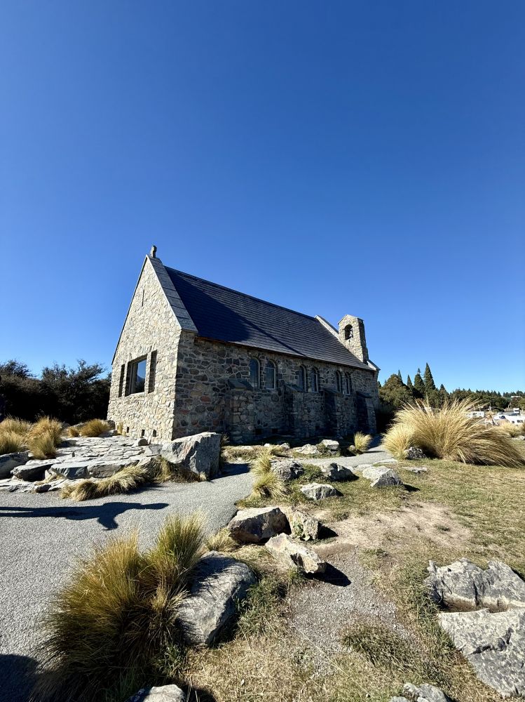 第二天,蒂卡波湖的天空湛蓝如洗,湖面在阳光下荡漾着银色的光芒,原本清澈的湖水仿佛变成了宝石蓝。我们第三次来到湖畔的Church of the Good Shepherd:这座被誉为全球最美的小教堂之一。这一次,教堂的门正好敞开着。教堂内部的装饰极为简朴,没有彩色玫瑰窗,也没有耶稣圣像。面向湖泊的一侧,是一扇巨大的玻璃窗,窗前静静伫立着一座朴素的木制十字架。