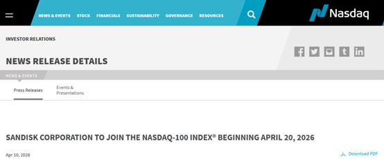 4月10日,纳斯达克官网显示,全球存储巨头闪迪公司(Sandisk Corporation)将于4月20日(周一)市场开盘前纳入纳斯达克100指数,软件即服务(SaaS)巨头Atlassian Corp Plc(TEAM)则被剔除。这标志纳斯达克100指数成分股的重大调整。