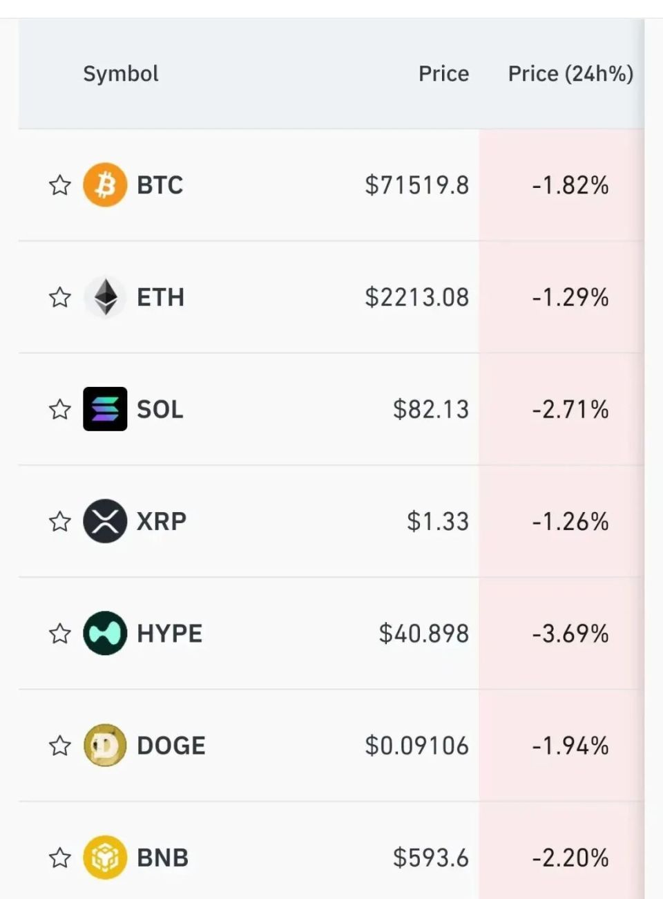 截至18时 ,比特币报71519美元/枚,日内跌1.82%。以太坊、SOL、狗狗币等同步下跌。 据CoinGlass数据统计,最近24小时,全球共有112613人被爆仓 。