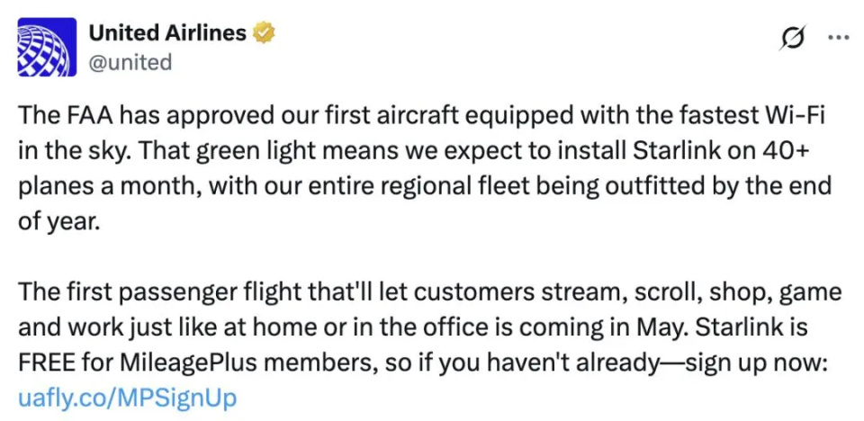 例如,美国联合航空从去年开始为飞机安装星链系统,到今年初已经有约300架飞机完成安装,计划在未来几年覆盖大部分机队;汉莎航空集团计划在超过850架飞机上推出免费Wi-Fi服务,包括汉莎航空、瑞士航空、奥地利航空、布鲁塞尔航空、意大利航空、欧洲之翼航空等航司的飞机……
