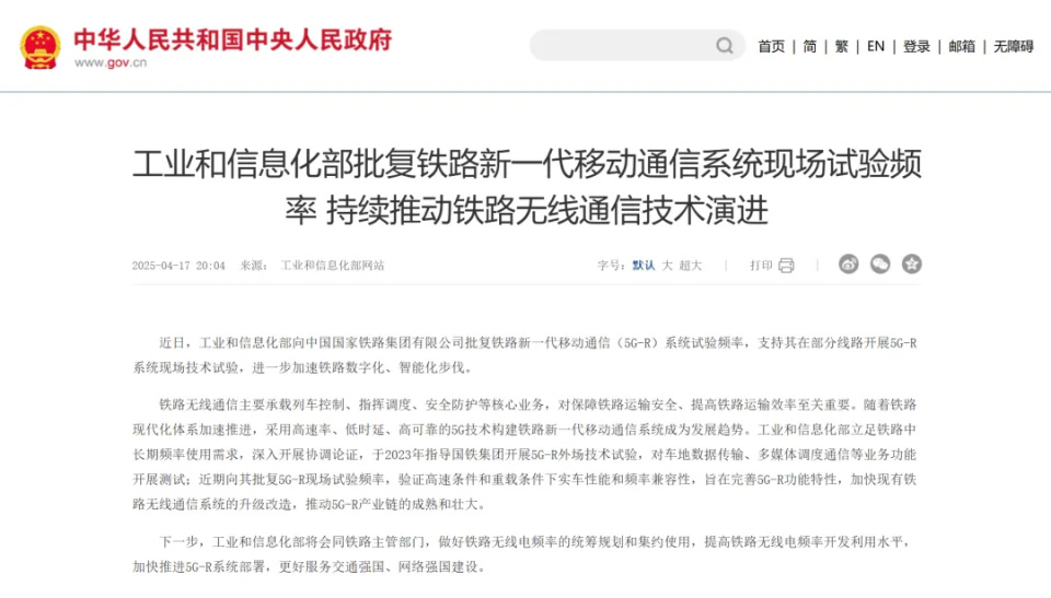 长期以来,我国铁路通信系统主要依赖基于2G技术的GSM-R,网速慢、时延高,已经难以满足时速超过350公里/小时的高铁了。去年4月,工信部正式批复铁路新一代移动通信(5G-R)系统试验频率。
